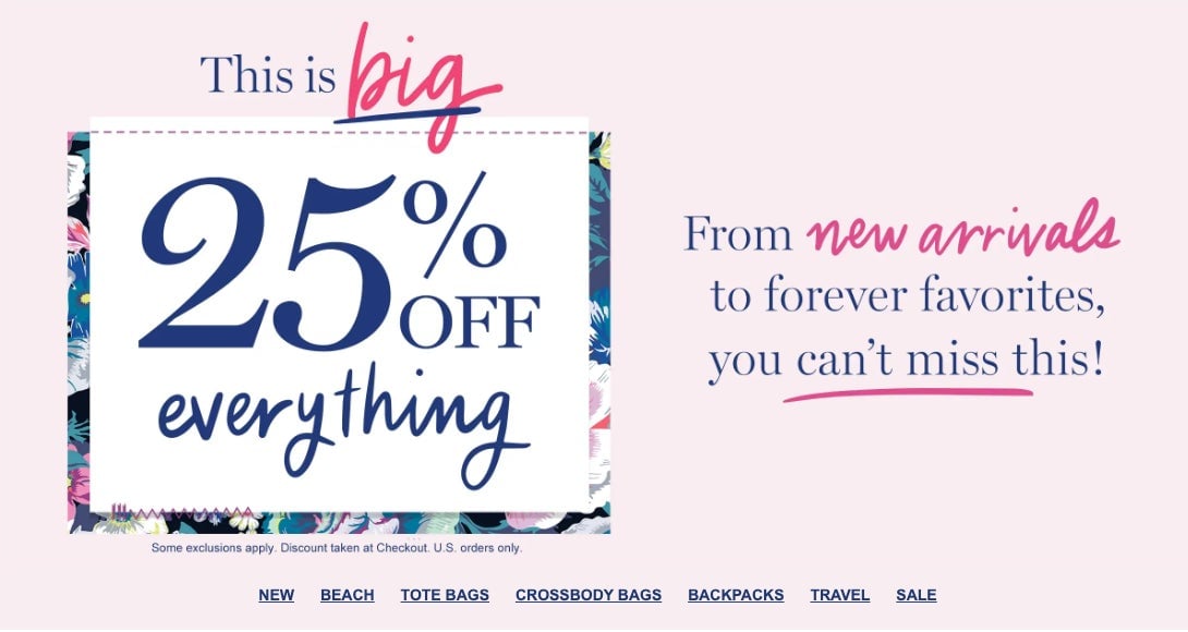 A person of circumstance is absolutely in need of a bag. And that person of circumstance is you! Vera Bradly is having a sale and everything is 25% off! Yes, from now until 2/19 you can get a pretty good discount on whatever suits your fancy from backpacks, tote bags, and even a dependable crossbody! Just make sure to grab one before they’re all gone. And pick one up for me, too.