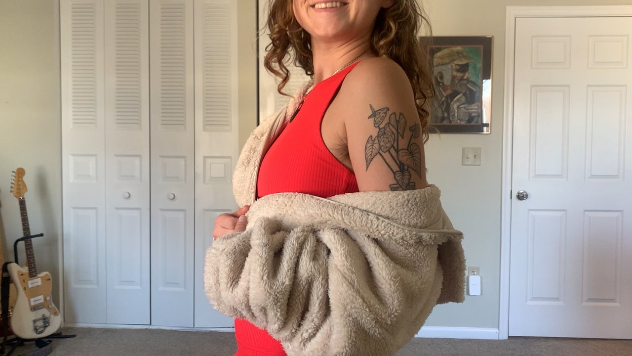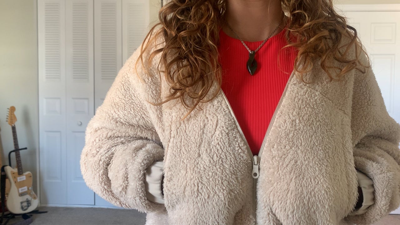 The jacket is well-made, and you can feel the quality of the fabric, especially in the elastic wrist and waist hems. From the fuzzy outside to the soft interior and even the zipper, everything about this jacket has been thoughtfully designed to look cute while also functioning super well for yoga.