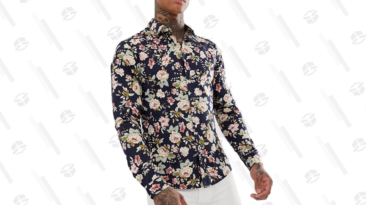 This one too! If you’re looking for a bold-yet-sophisticated floral print you could get away with at a formal event or at a work event, might I suggest this ASOS Design shirt? You could downplay the florals under charcoal or navy suit, or really let it pop with khaki chinos. Honestly, your coworkers won’t know what hit ‘em when you show up to Karen From marketing’s farewell rooftop drinks.