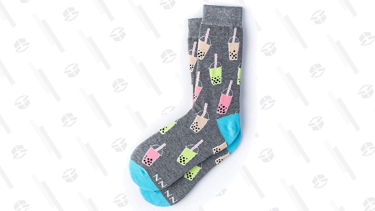 If you prefer to wear your love for boba, you can pick up a pair of crew length socks with floating cups of pink, green and light brown bubble tea. Both men’s and women’s sizes of the “Boba is Life” socks are available.