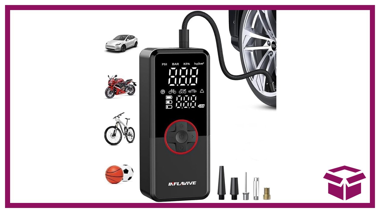 This compact portable air compressor makes it easy to top off tires at home or on the go. It’s suitable for cars, motorcycles, bikes, and even sports equipment. The lightweight, cordless design means you can stash it in your trunk and be ready for unexpected low-pressure situations.