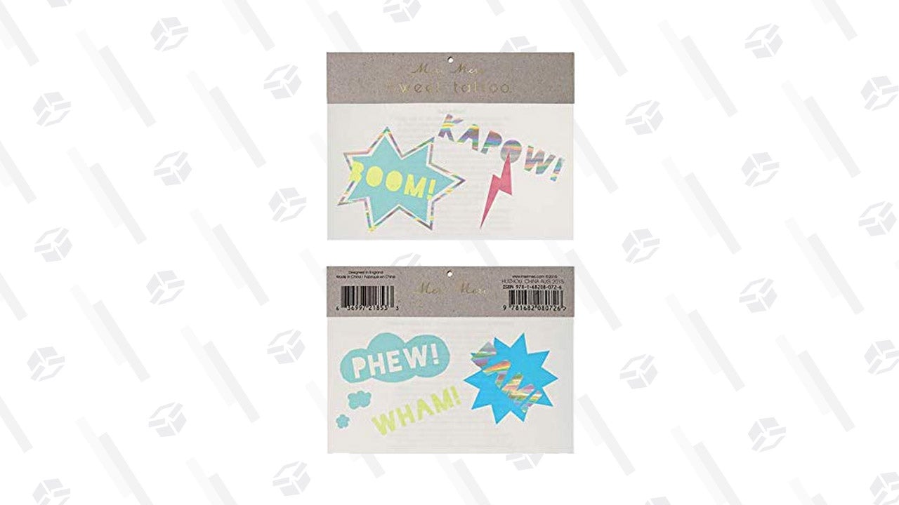 For the budding superhero, Meri Meri’s boom kapow tattoos also have a nice metallic accent.