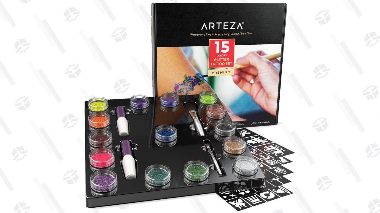 The Arteza Glitter Tattoo Kit is for the serious temporary tattoo artist—the kit that professionals use at carnivals and birthday parties to make elaborate and shimmery tattoos. It’s much more involved and not your simple “dampen and hold on your arm for 30 seconds.” Instead, it comes with 40 stencils, which you use with body glue and 15 colors of glitter that you dust on with a brush. Break this out for special occasions to create beautiful and fanciful tattoos for you or your little one.