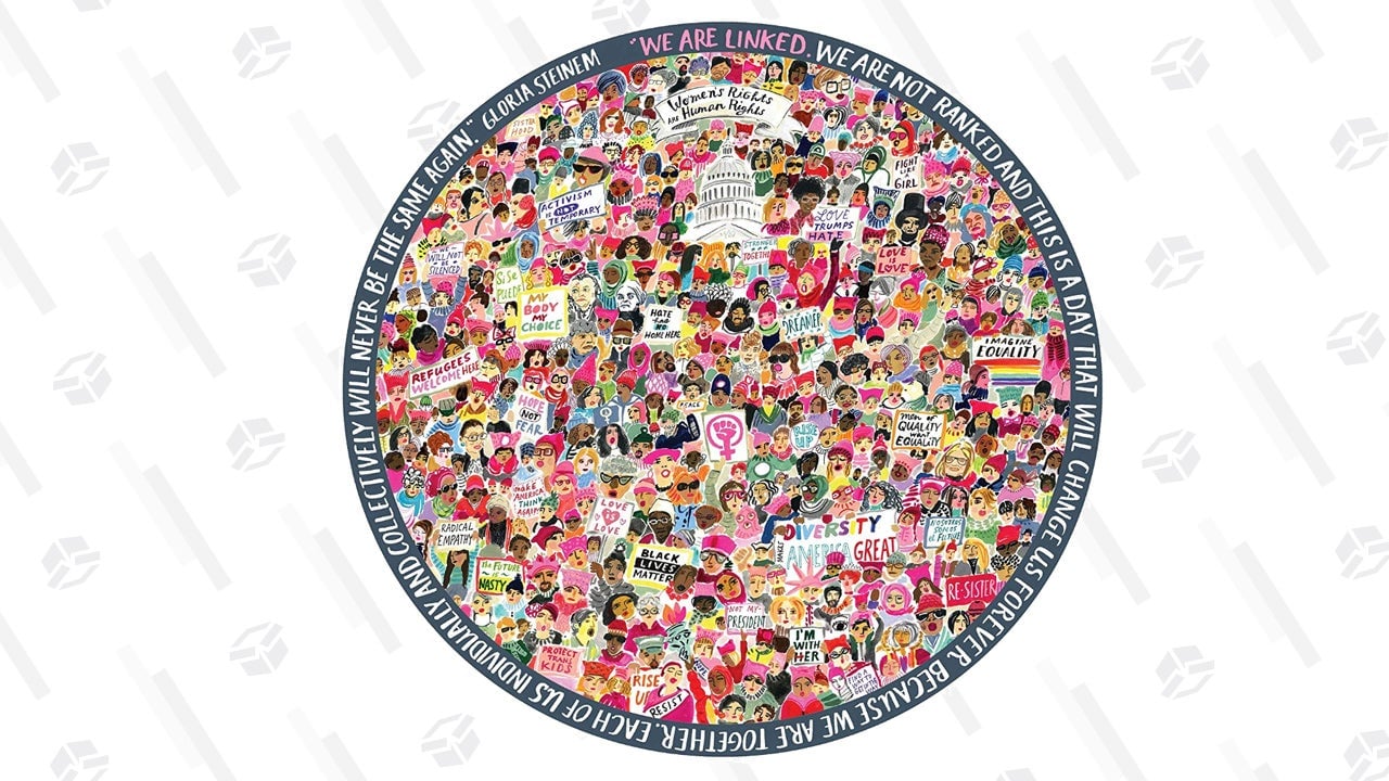 This round, 500-piece jigsaw puzzle captures the spirit of the Women’s March. A multicultural crowd of protesters, with famous figures such as Ruth Bader Ginsburg tucked in, hold signs such as “Fight Like a Girl,” “Black Lives Matter,” and “Hate Has No Home Here.” A quote by Gloria Steinem frames this Women’s March jigsaw puzzle.