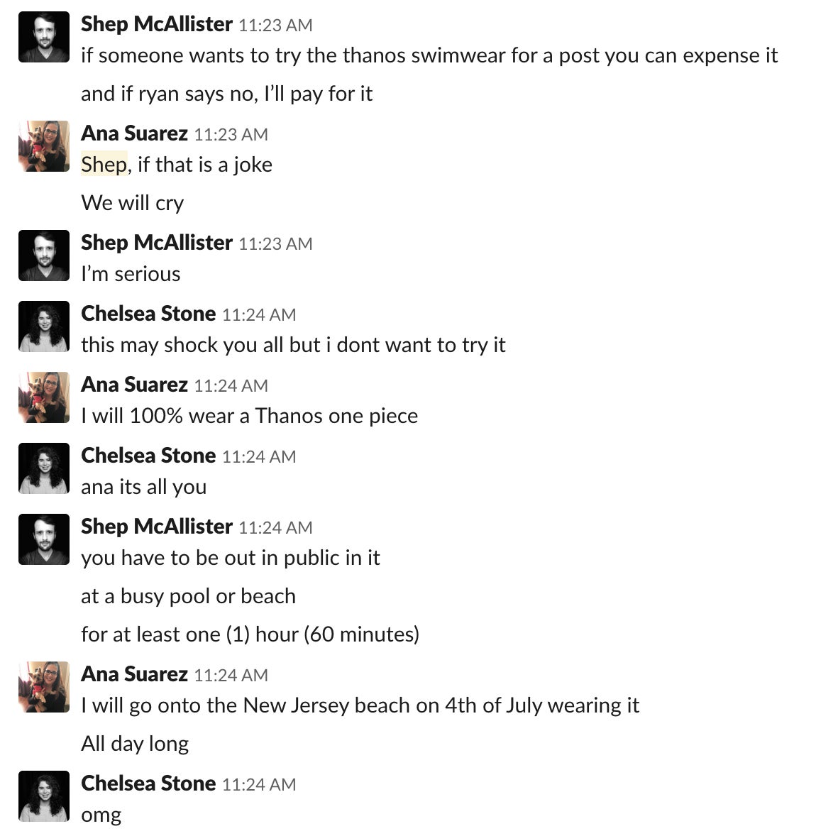 On June 13, 2019, my coworker Chelsea Stone saw a tweet about a Thanos bathing suit for women. Because she does her due diligence, she didn’t just send us the tweet to laugh at, but she also found the bathing suit and sent it in our team Slack as well. Then she proceeded to send us several more Thanos bathing suits, both one-pieces and bikinis, that were available on Amazon. It’s a whole thing!