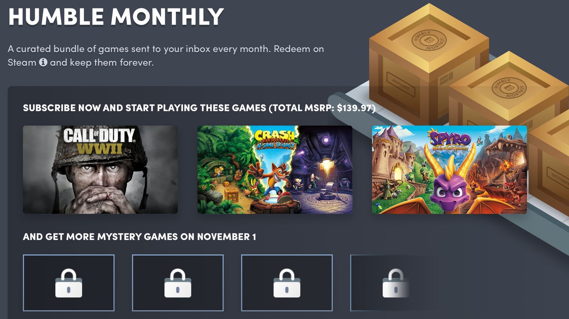 Humble Monthly’s new batch of early unlock games is one of the service’s most enticing offerings in quite some time. If you subscribe (or are already subscribed) to the service this month, you’ll get a Steam copy of Call of Duty WWII, the Spyro Reignited Trilogy, and the Crash Bandicoot N.Sane Trilogy instantly, in addition to whatever mystery games unlock at the end of the month.