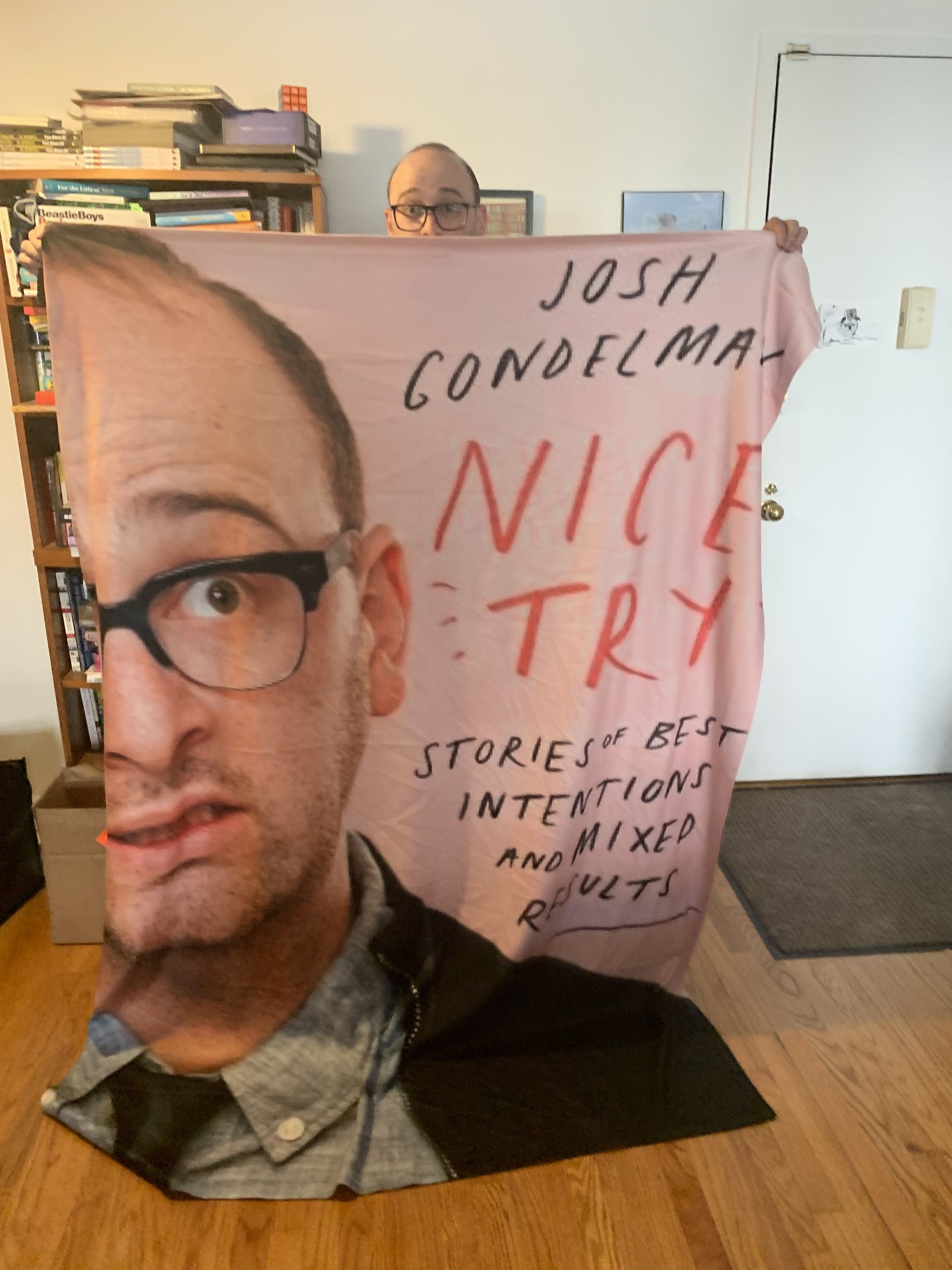 Josh Gondelman: My wife got me a giant custom blanket with my book cover on it, which was so sweet!!!