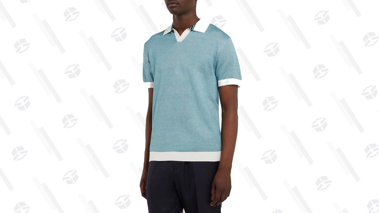 I always enjoy seeing how Mr Porter’s in-house brand interprets their favorite menswear trends of the season. This delightful Mr P. Italian-knit polo has some serious retro vibes thanks to a button-free v-neck (called a ‘Johnny’ collar) and that teal-and-white color combo that looks like a Slim Aarons photo you can wear.