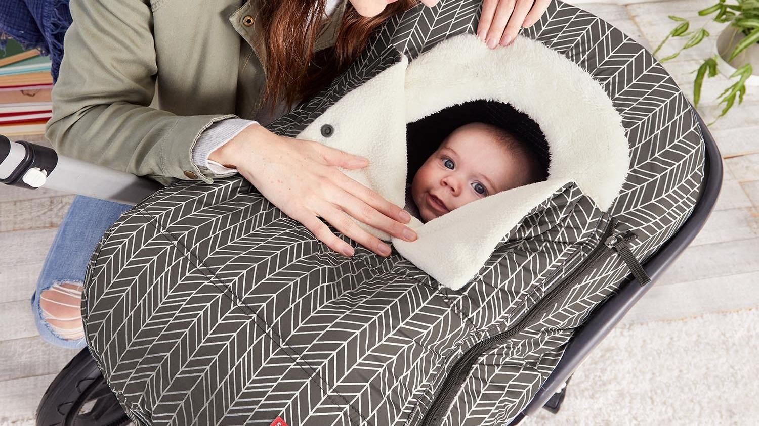 Meant for the car seat (and some strollers), both the JJ Cole Carseat Cover and the Skip Hop Car Seat Coverslip over the car seat like a fitted sheet with a hole cut out. This means that the cover doesn’t interfere with the car seat straps (keeping the integrity of your car seat secure), but still allows you to zip up the blanket so your baby can stay snug and warm inside.